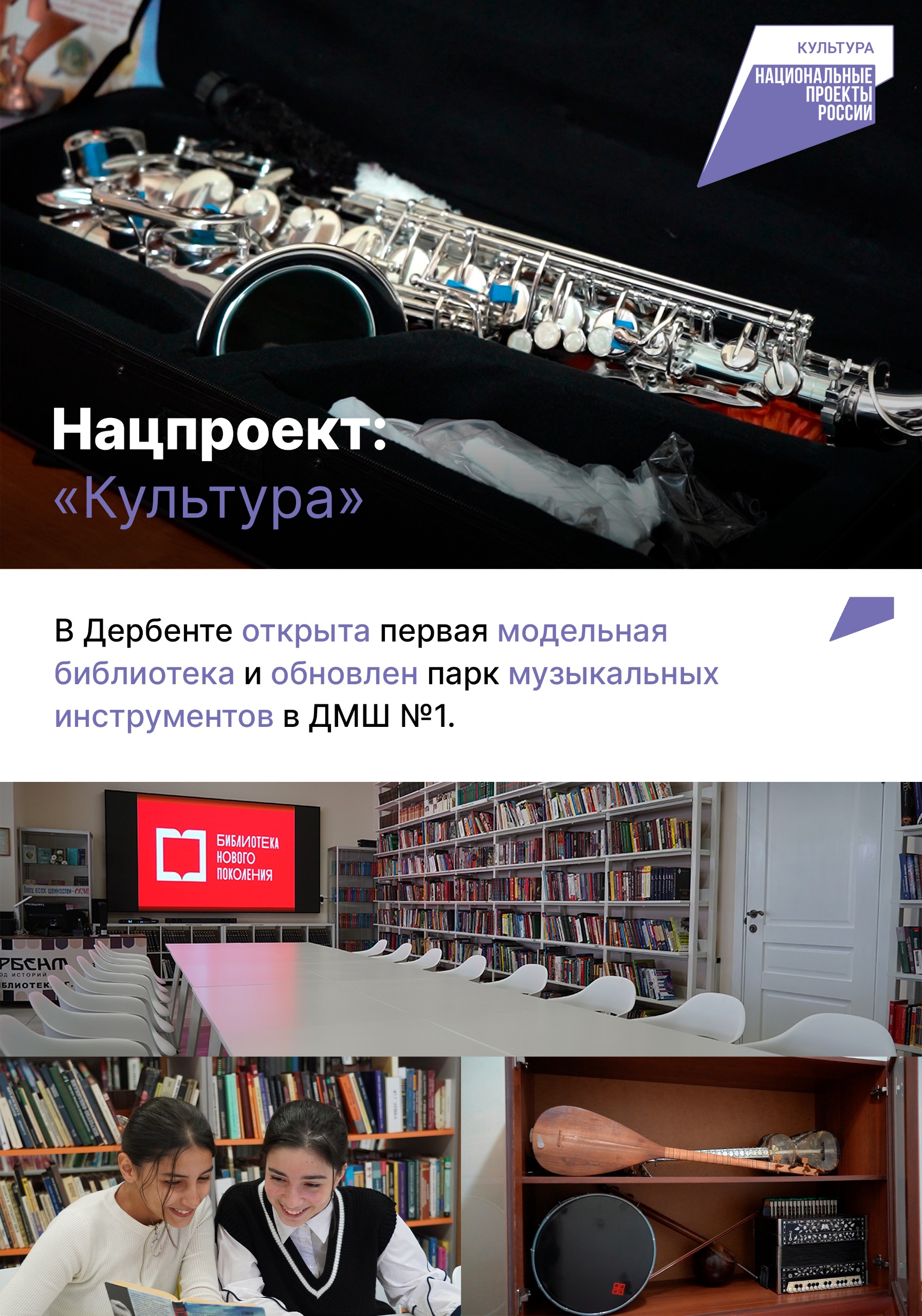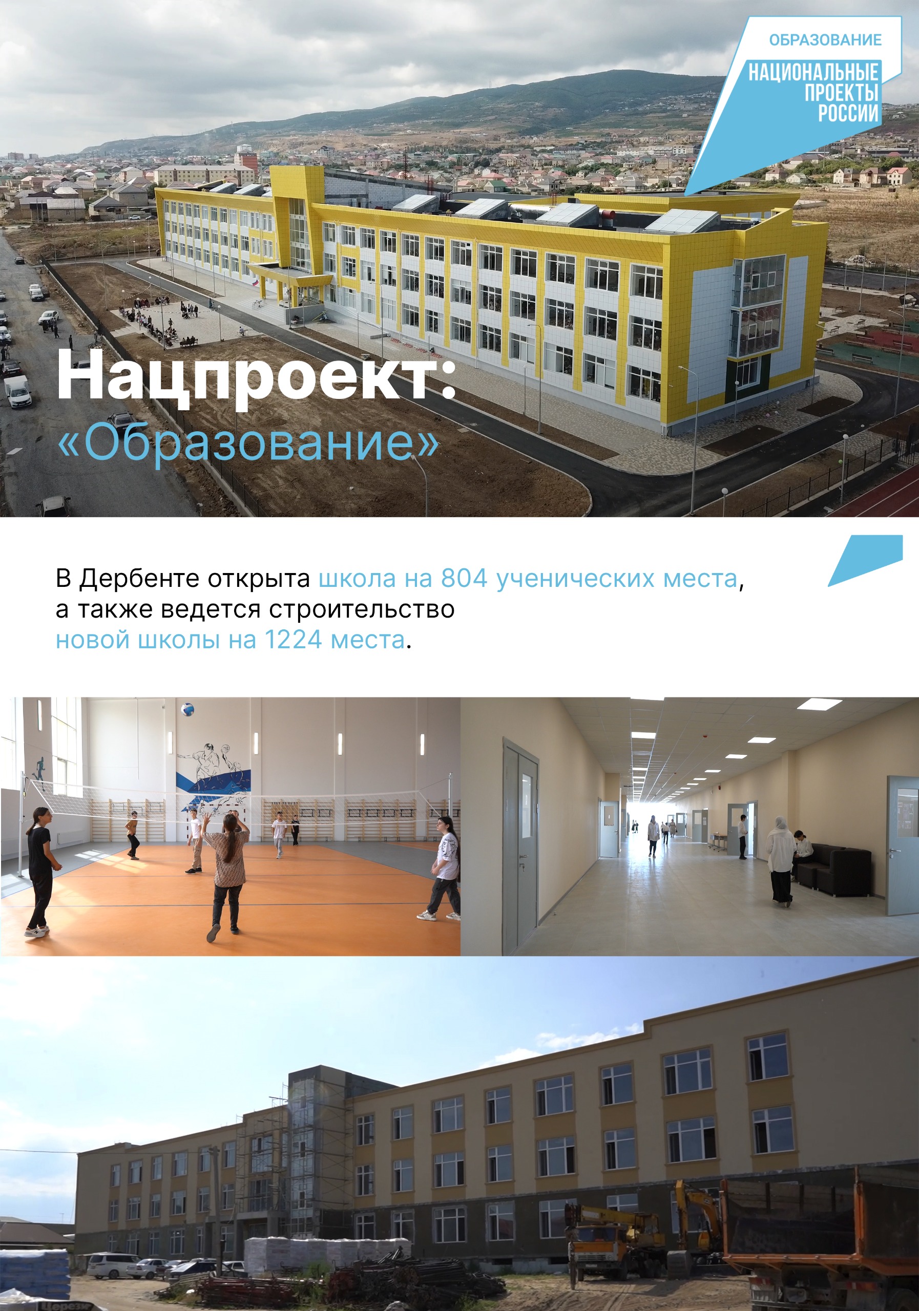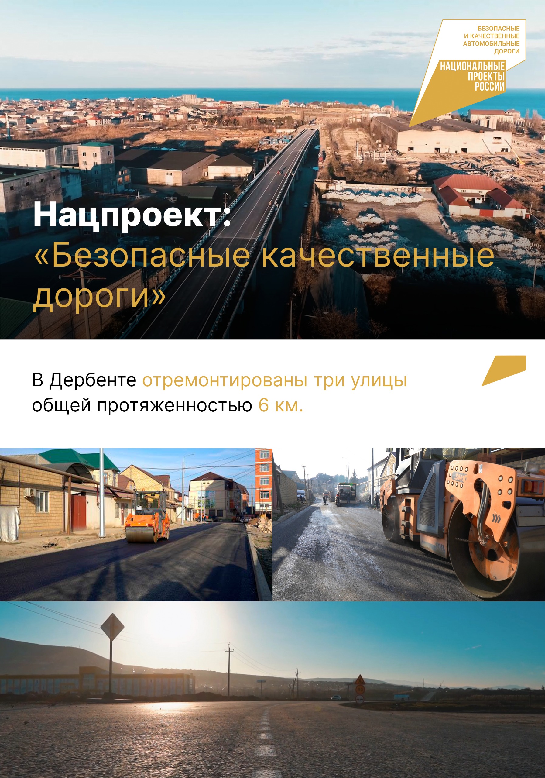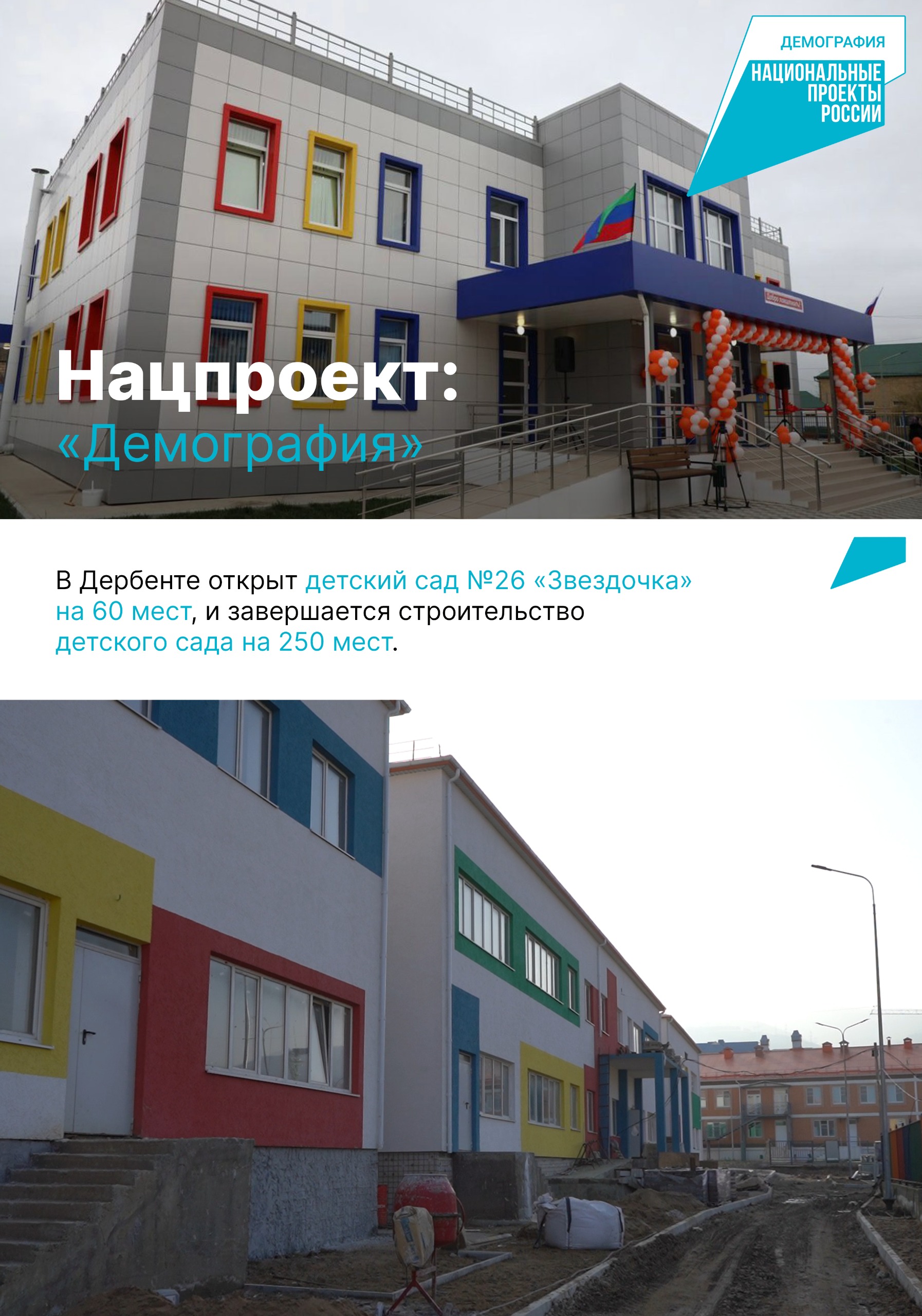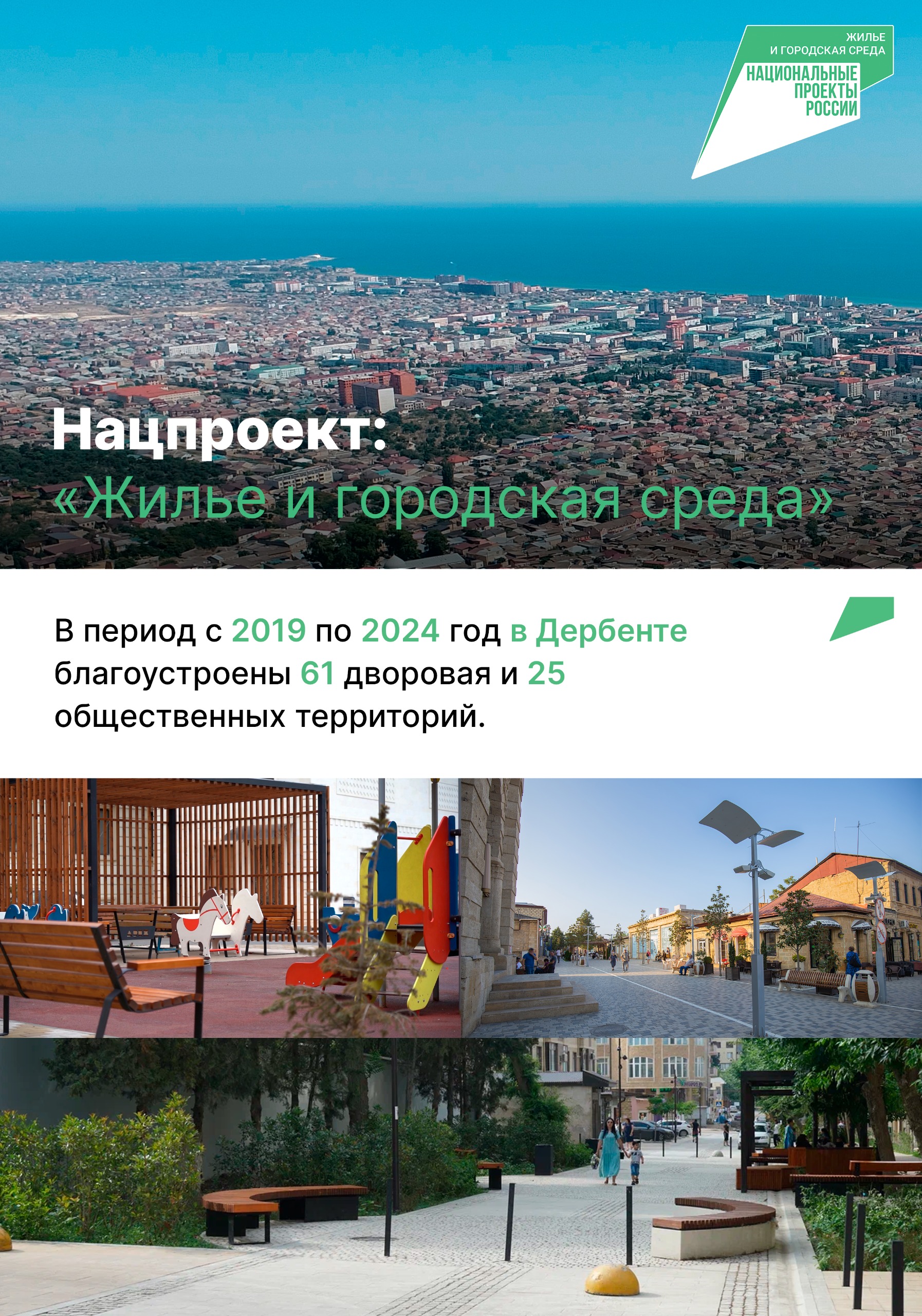 В 2024 году завершена реализация нацпроектов в России. С 2025 года вступают в силу новые. В карточках подводим итоги реализации за 6 лет в Дербенте нацпроектов «Демография», «Образование», «Культура», «Безопасные качественные дороги» , а также «Жильё и городская среда».
