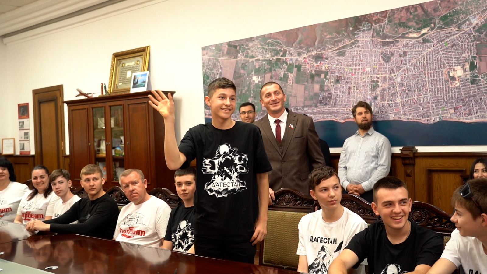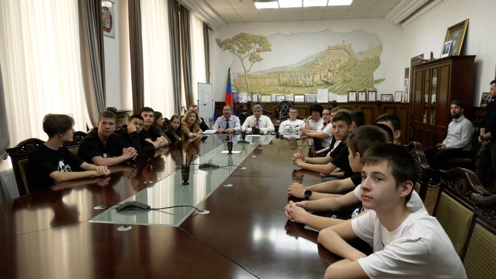 Вместе с детьми в видеоконференции приняли участие глава города Дербента Ахмед Кулиев, председатель Собрания депутатов Гасан Мирзоев и начальник Управления образования Чимназ Алиева. В Херсонской области на связь вышли заместитель главы Каланчакского муниципального округа Галина Мирошниченко, представители администрации, родственники детей.