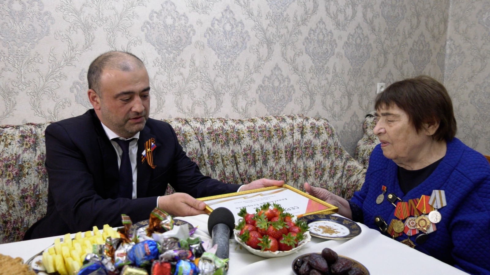 В теплой обстановке за чашкой чая Ханлар Пашабеков пообщался с узницей концлагеря, пожелал крепкого здоровья и долгих лет жизни, а также вручил сертификат на 100 тысяч рублей к юбилею Великой Победы.