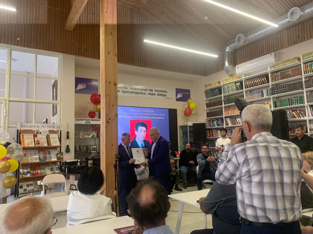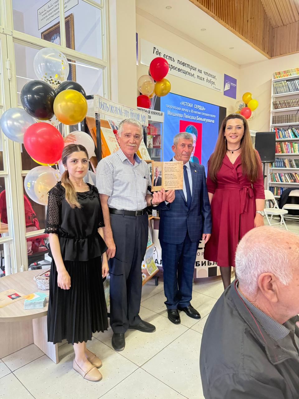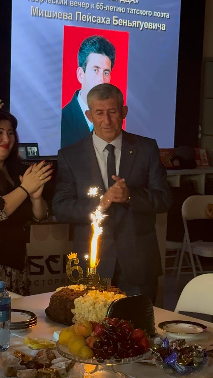 Творческий вечер, посвящённый 65-летию татского поэта Пейсаха    Мишиева, состоялся сегодня, 28 мая, под крышей уютного книжного дома, каким Центральная городская библиотека нового поколения им. Мирзы Казем-Бека стала для пишущих людей и истинных ценителей поэзии.  Поздравить поэта с юбилеем пришли представители администрации города, общественных организаций, деятели культуры, коллеги по поэтическому цеху, родные и друзья.